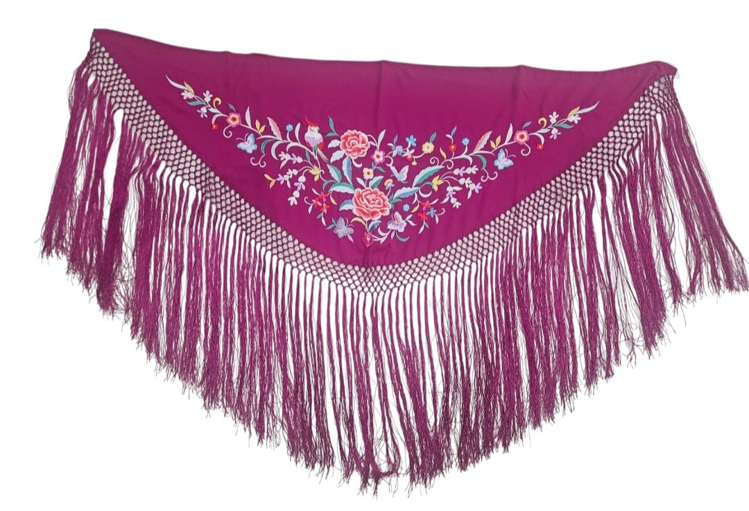 El mantón "Flores de Pasión" es una obra de arte textil que combina tradición y elegancia en cada detalle. Confeccionado en un vibrante tono magenta, está decorado con exquisitos bordados florales en colores vivos que celebran la belleza de la naturaleza. Su diseño triangular está rematado con flecos largos y delicados que añaden movimiento y sofisticación a cualquier look.