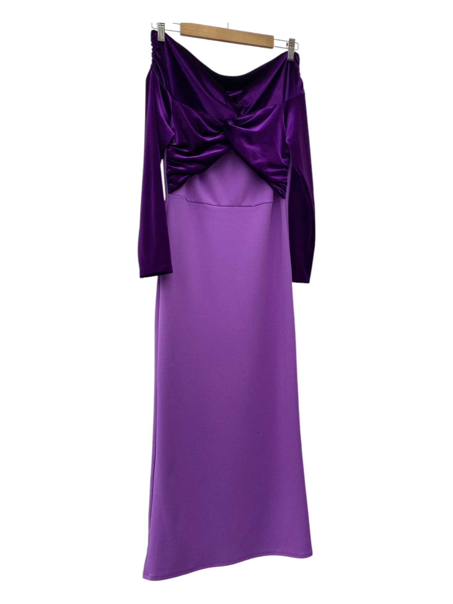 Luce elegante y sofisticada con este Vestido Largo de Terciopelo Morado con Detalle Fruncido.